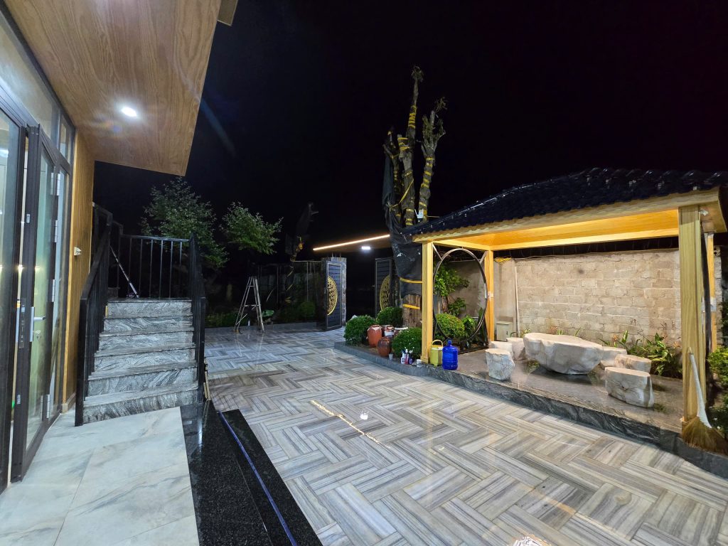 Kiểu vân sọc thẳng này giúp bề mặt đá nhìn tự nhiên nhưng vẫn mang tính thẩm mỹ cao, rất phù hợp với các công trình biệt thự, resort, homestay và khu nghỉ dưỡng.